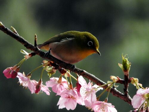 河津桜を目当てに何日も竹島近くのホテルの庭園に出かけてみたら… やっと目の前にメジロたちがやって来てくれました^^ この日は平日なので人の姿はありません。一人占めです^^V ヒヨドリはこちらの姿が見えたとたんにどこかに飛んでいきました。 メジロ…