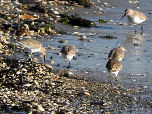 竹島海岸でイソシギ(だろうと思うけど?)を見かけました。 1年ぶりです。カメラを持ってそっと近寄っていったら… 一斉に飛び立ってしまいました。警戒心が強すぎです。 次の日,この日は防潮堤でアオサをつついています。 砂浜に隠れてる虫などを食べてる…